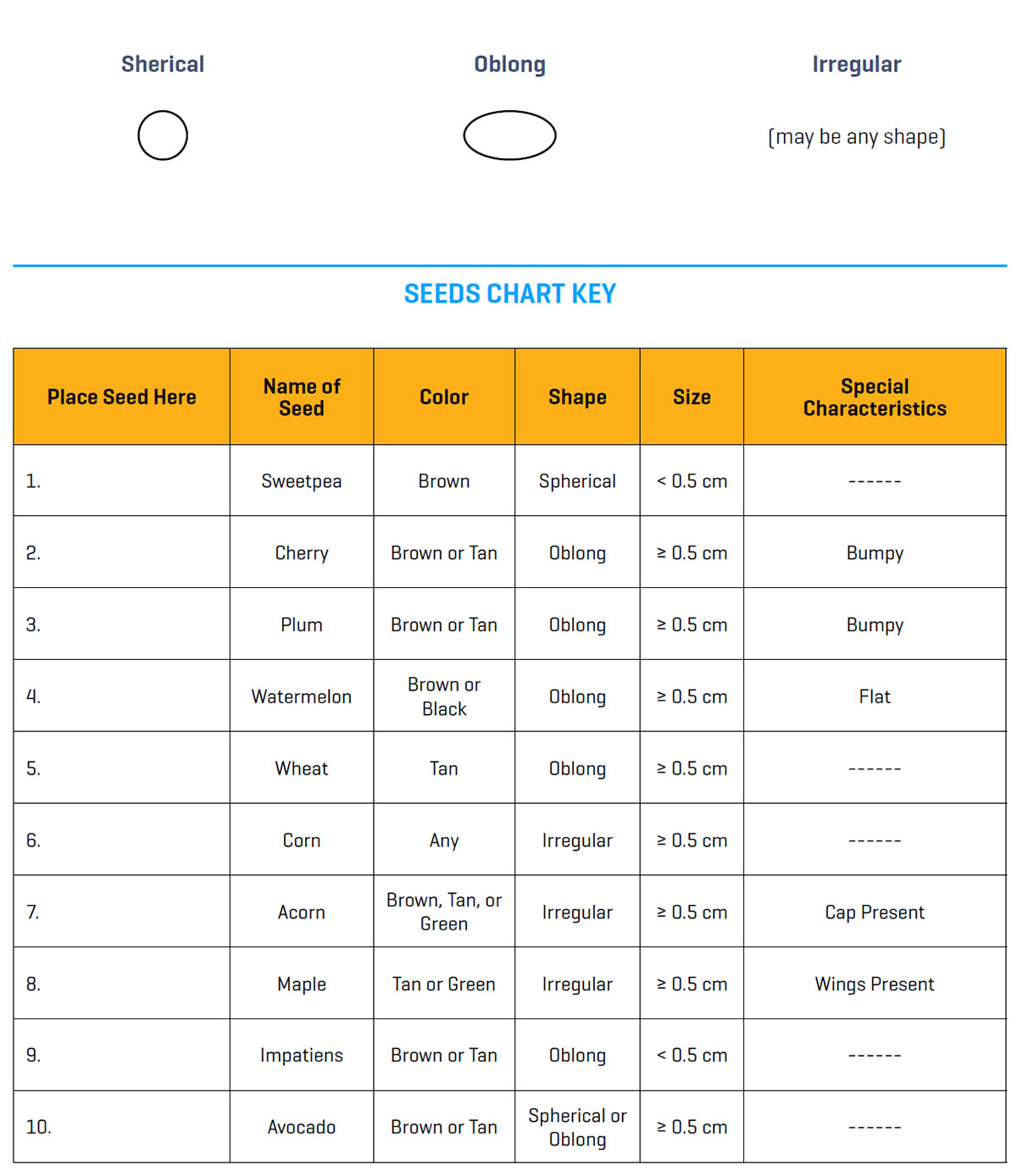 - Explore/Explain: Give students a copy of the Seeds Chart Key and introduce it as a special tool that scientists can use to identify unknown objects. Direct students’ attention to the column headings and the pictures. Remind them that the first thing they should do when using a key is to look at any pictures, labels, or headings. Students should then try to identify each seed using the key. Then, read the book Seeds by Ken Robbins aloud to the class. Each seed is named and pictured in the book, so students can check their answers as you read.