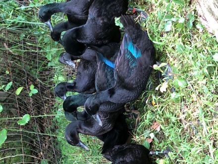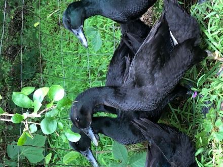 Cayuga ducks are not pure black. They have iridescent blue-green feathers, and occasional patches of white or brown. They really love water, and in fact, they need to be immersed in it regularly to stay healthy.