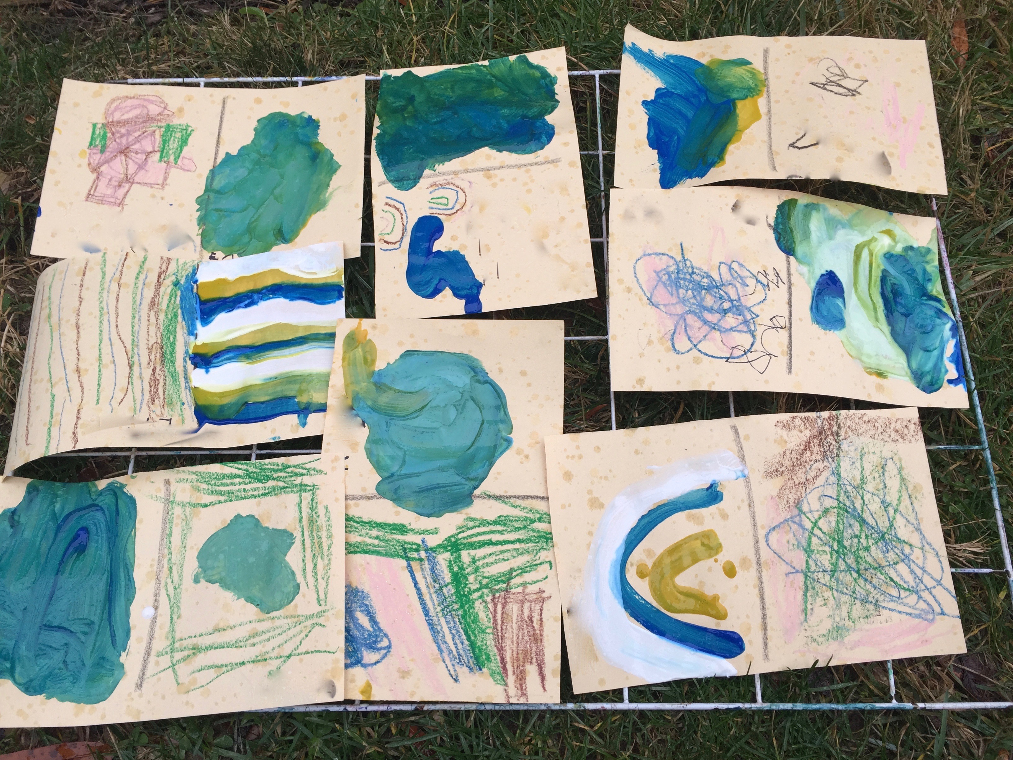 The next time we met, our conversations about what changes the rain made to their finished work with the two media were brief. “It got wet!” “Now it’s dry.” What I want to know is if they wondered why the pastel lines did not blur or spread out in the rain like the paint shapes did, and if they are aware of the waxy feel of the pastels (PS1.A Structure of matter ). What next steps could I introduce? Maybe I should wait for children to bring up their own experiences with rain. Perhaps we could get out the “rain” containers on a warm rainy day and compare the shape of natural rain drops splashes to those from the containers. Or on one of the scheduled summer playground “water days” have children paint directly on a large Plexiglas easel and spray it after painting. Oil pastels on the Plexiglas? The children would probably enjoy scrubbing it off with soapy water—another way to learn about the differences between media.