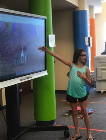 At the end of the hackathon, the entire camp gathered to share their creations, and parents were invited to watch the presentations. The coders ran their codes on a large Smartboard in the library for everyone to see, while other groups showed off the items they made by 3-D printing or using the vinyl cutter. Still other groups shared their robots made using Hummingbird kits. The excitement was evident in each girl’s presentation. They were proud of themselves for creating something using new technology, and they had the confidence to share their creations in front of their peers.