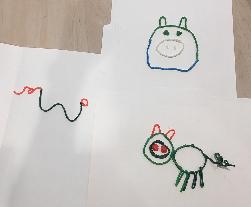 As a final step before launching into product design, youth engage in tactile activities to identify key design considerations for effective tactile graphics. This may involve sculpting objects out of clay, exploring different textured materials, or using wax sticks (e.g., Wikki Stix) to create tactile images. Many groups opt to play a game in which a designer creates a tactile image to be interpreted by other team members who are blindfolded. Through this exercise, youth designers intuit key design principles, such as emphasizing the most critical elements of an illustration, minimizing unnecessary detail, and providing context and labels (Figure 4).