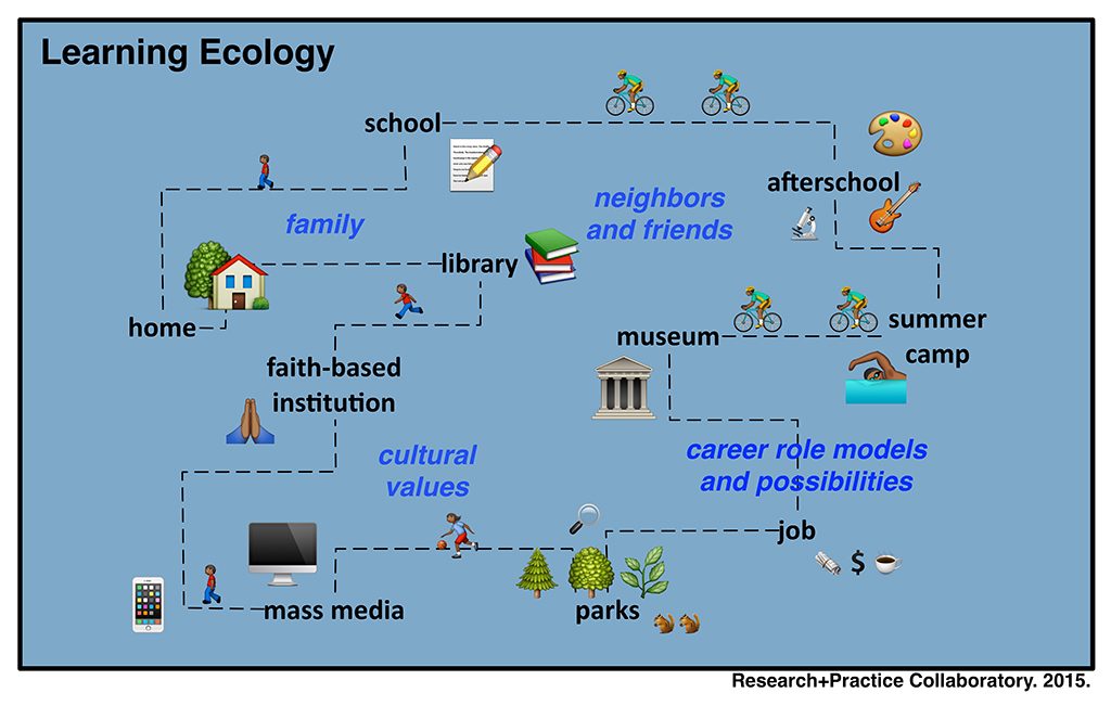 Ecological theories of learning are based on the idea that learning develops over time and in multiple settings. Learning opportunities are made possible and shaped by the learning ecology that one inhabits. A learning ecology is the physical, social, and cultural context in which learning takes place. Like natural ecosystems, learning ecologies (see Figure 1) have physical dimensions, which may or may not include easy access to nature, science museums, or advanced science programs or internships. But we are less used to thinking about the sociocultural dimensions of ecologies. Imagine the ecology of your workplace. It has physicality (e.g., geographic location, objects such as desks or exhibits, Smartboards or theaters, people), but it also has a history. There are people in it who have distinct and interacting functions. There is an institutional culture that shapes goals and social interactions. The system evolves over time, but it is characterized by overall equilibrium and stability (even if stability means constant change). What you can accomplish at work is fundamentally shaped by the larger sociocultural ecology of your workplace.
