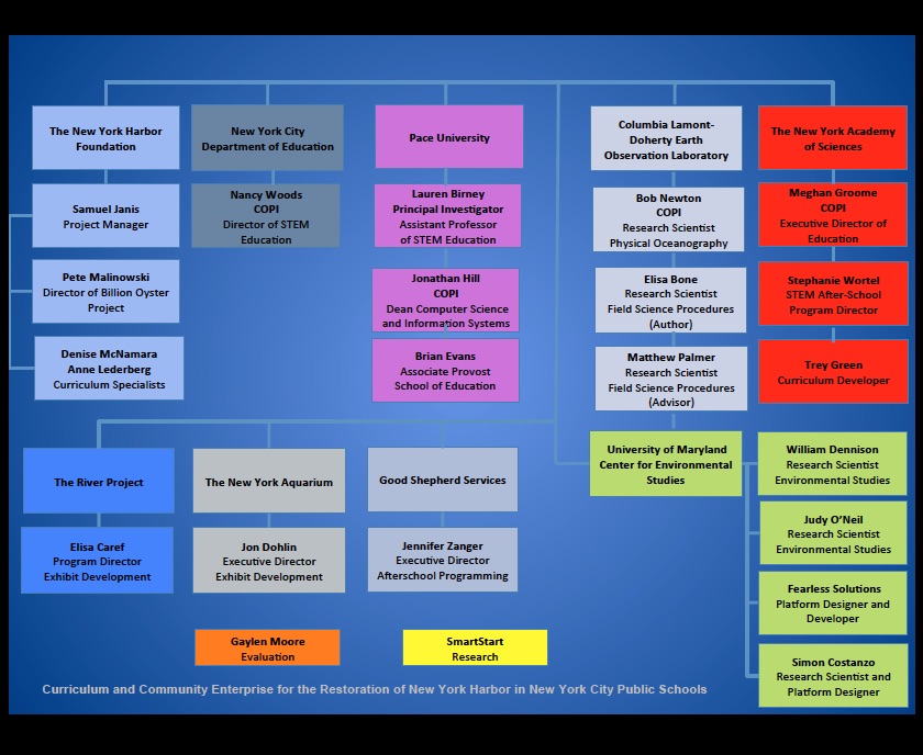 | Columbia University’s Lamont–Doherty Earth Observatory (CLDEO) | CLDEO leads the development of the student field research procedures for oyster gardening and restoration projects, supports teacher training, and advises on the environmental BOP STEM -C curriculum. |