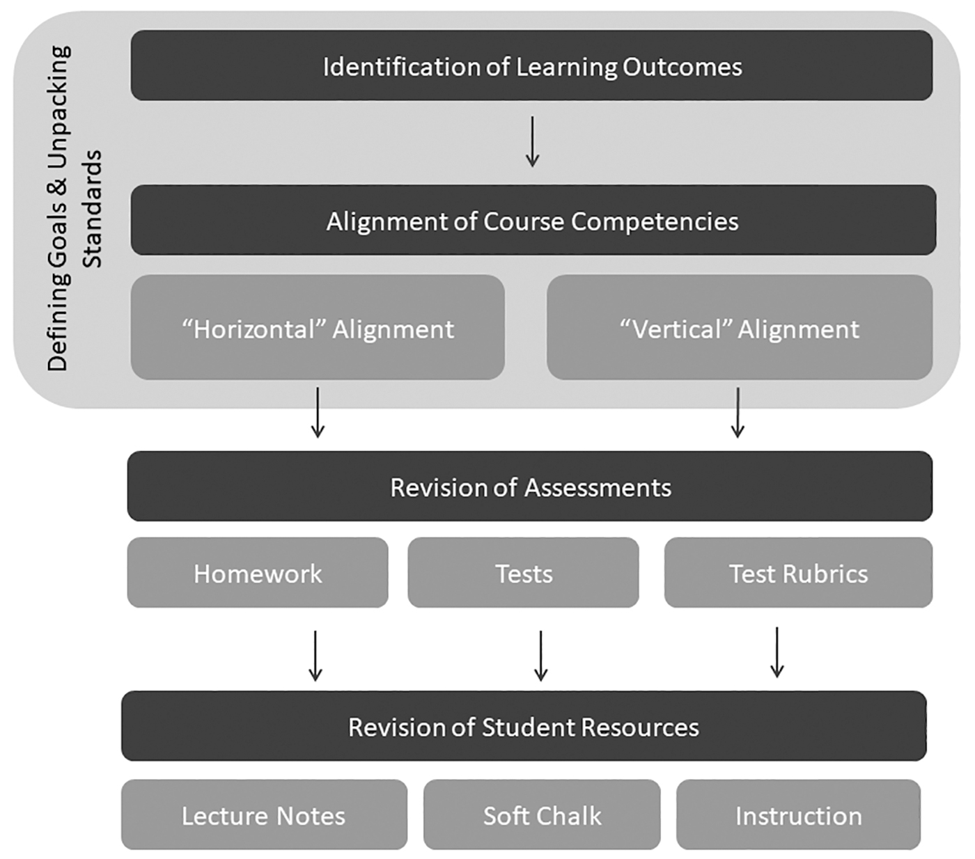 Analysis of the completed course redesign revealed the methods used closely aligned with the backward design model and the UbD framework, as described by Wiggins and McTighe (2005). The method of realignment, outlined in Figure 1, required three main steps: (1) defining goals and unpacking standards, which included identification of learning outcomes and alignment of course competencies; (2) revision of assessments; and (3) revision of student resources.