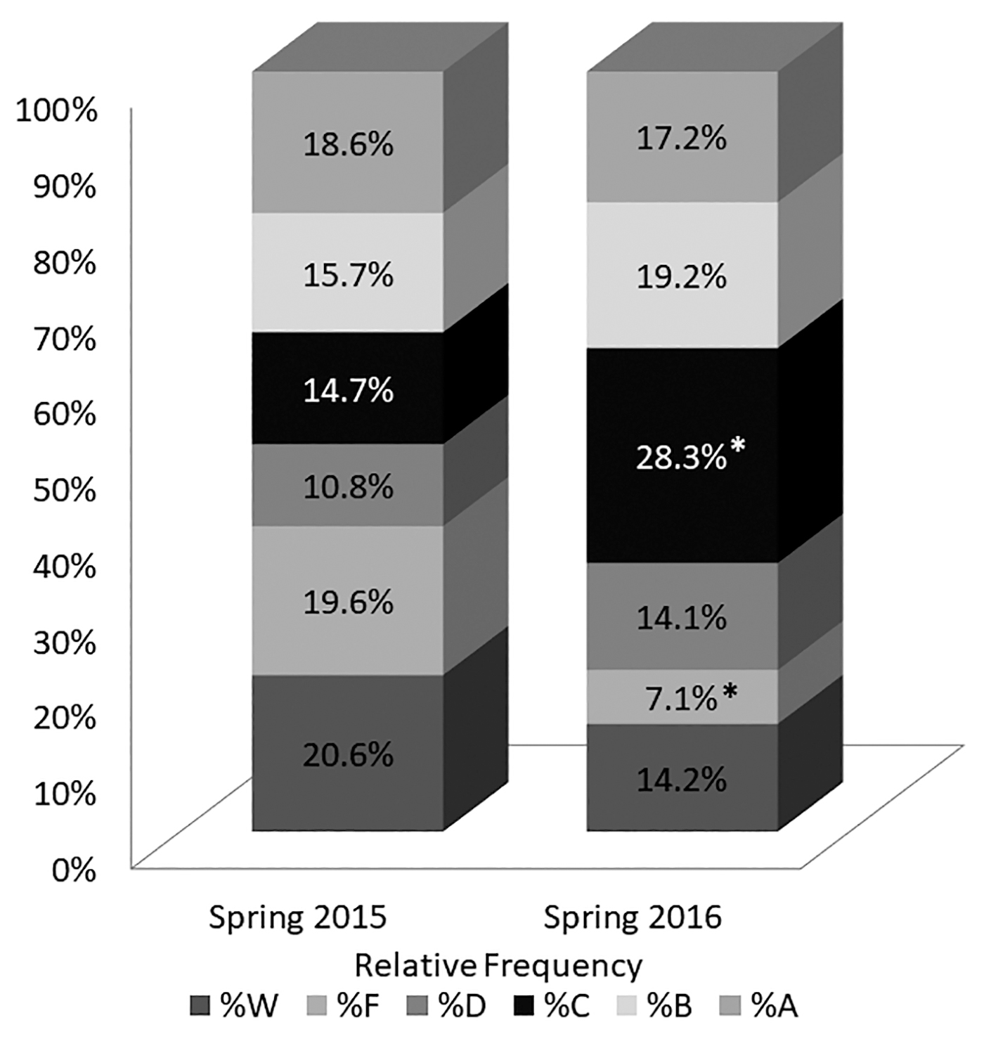 The change in %A and %B was not significant, but there was a significant increase in %C (sp2015: 14.7%; sp2016: 28.3%), and a significant decrease in %F (sp2015: 19.6%; sp2016: 7.1%). Although there was a decrease in the %W, it was only significant at p < 0.10 (sp2015: 20.6%; sp2016: 14.2%). End-of-term data revealed the overall pass rates (%ABC) in Biology I increased significantly (sp2015: 49%; sp2016: 64.7%). There was a significant decrease in students not passing (%DFW) from 51% in sp2015 to 35.4% in sp2016. Table 1 summarizes the overall change in %A+B, %ABC, %W, and %DFW. The total percentage of withdrawals (%W) includes both withdrawals before midterm (W) and administrative withdrawals (WF).