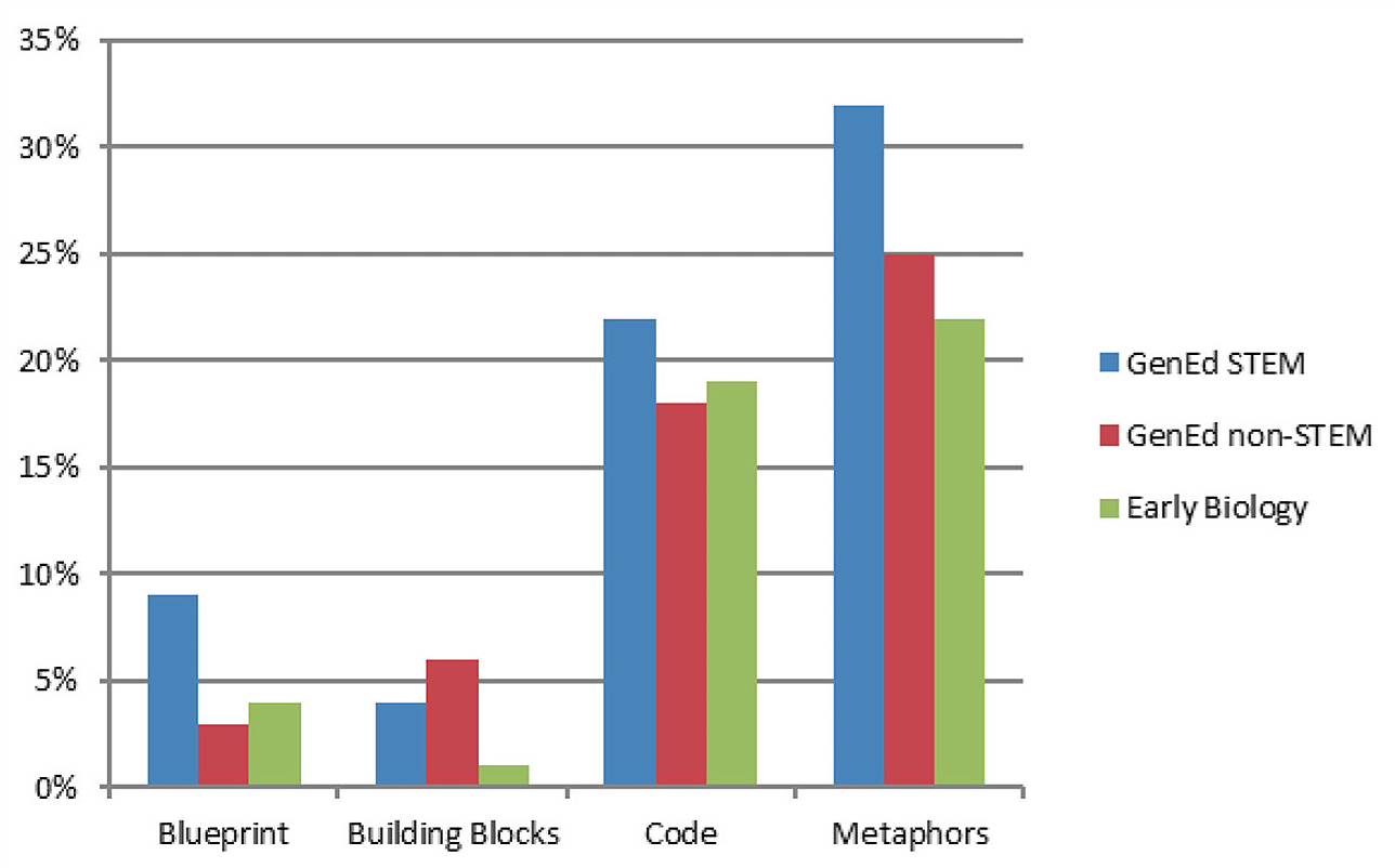 Figure 5 shows that students from all groups offered trivial or uninformative descriptions of DNA. These responses included spelling out DNA as deoxyribonucleic acid and stating that DNA is “what makes us up.” Early-biology students spelled out deoxyribonucleic acid more often than the GenEd non-STEM students. Only 7% of the early-biology students indicated DNA is “what makes us up,” compared with 20% of the GenEd, non-STEM students. Spelling out DNA is formally correct, but does not indicate understanding. There are many biological components in humans, of which DNA is just one. Figure 6 shows that GenEd STEM students used metaphorical statements more often than the early-biology and non-STEM students. For all three groups, the most popular metaphor is that DNA contains a code. A typical statement is “The unique genetic code that exists in our bodies.” Students using these metaphorical statements may be in the preliminary stages of being science literate, because these expressions build the foundation for sophisticated stages of comprehension (Koballa et al., 1997).