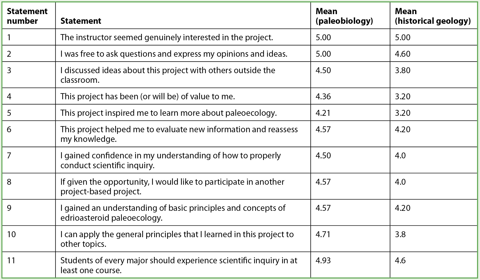 The mean was calculated for the responses to each statement in the Likert questionnaire (Table 2). Students in the paleobiology course rated all statements above a 4.0, and students in the historical geology course rated most of the statements above a 4.0. Scores were slightly lower overall for the historical geology class, which can happen when only five students take the survey. A higher response rate might have captured the opinions of a wider range of students (e.g., first-year vs. second-year students and nonmajors vs. majors). Overall, these high scores indicate that this exercise contributed to student understanding of the scientific process and helped students with their understanding of paleoecology.