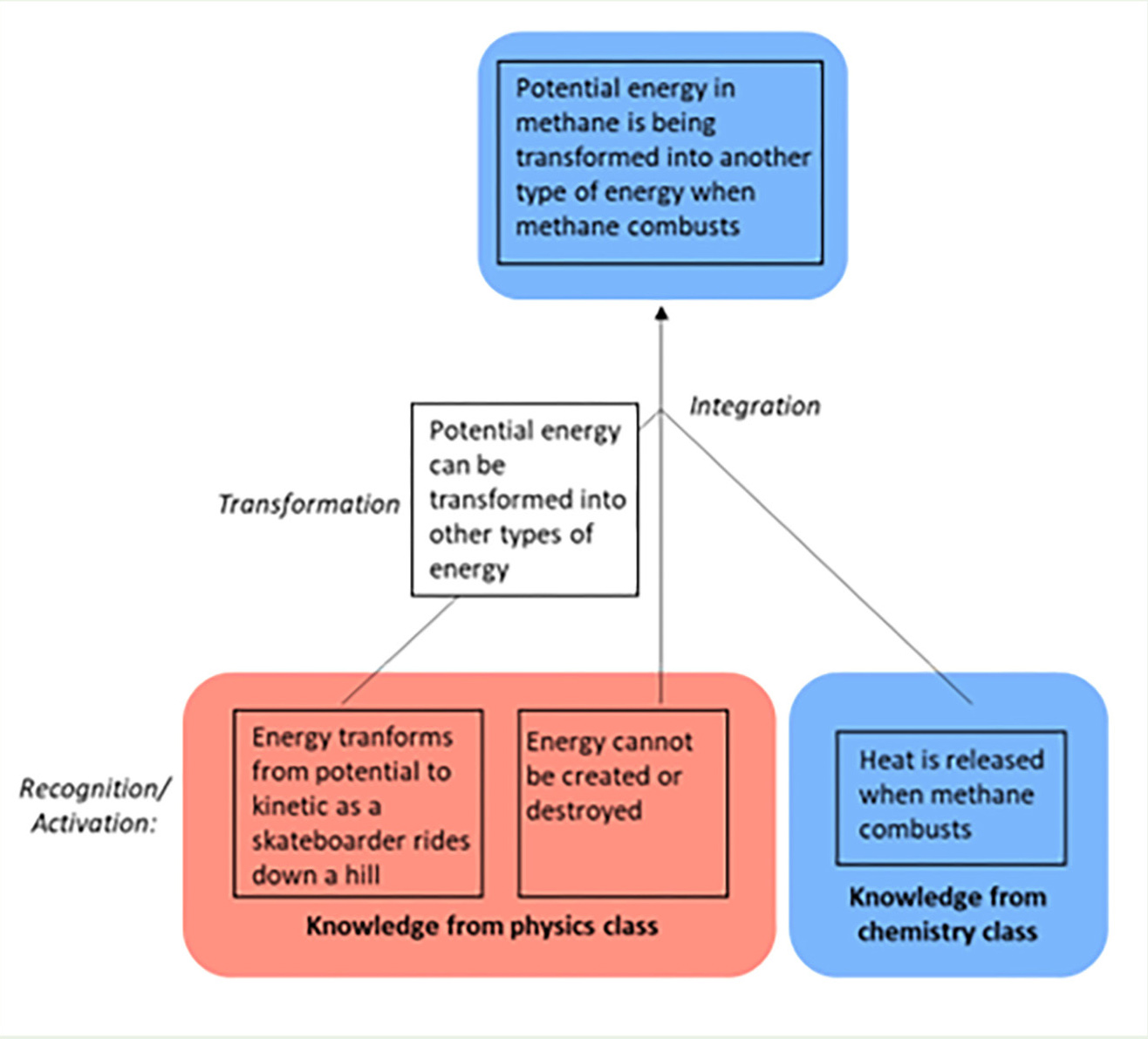 The vignette featuring Amara illustrates the kind of science learning we hope our students will achieve. In this vision, concepts and skills acquired in foundational courses are combined to support learning in later courses, including in novel disciplinary contexts. We refer to this process as “cross-disciplinary learning” and provide a model, featuring Amara’s reasoning, in Figure 1. Encountering a learning challenge in a novel disciplinary context triggers activation of knowledge developed in previous coursework, such as ideas about potential energy and energy conservation from Amara’s physics course, as well as knowledge from current coursework, such as the observation of increasing temperature during methane combustion. Some activated knowledge elements are transformed as Amara combines them. For example, the idea that potential energy transforms into kinetic energy, originally learned in physics, is recast in a more general form, which can be more readily combined with the knowledge from chemistry that heat is released when methane combusts. The integration of these energy ideas then supports the development of a new insight that potential energy associated with methane transforms during combustion. Overall, cross-disciplinary learning involves active synthesis, possible through the (perhaps implicit) recognition that some ideas (e.g., energy cannot be created or destroyed) apply to situations with widely disparate surface features (e.g., skateboarding and methane combustion). We note that activation, transformation, and integration are broadly consistent with constructivism (Colburn, 2000; Piaget, 1978; Vygotsky, 1978), which frames learning as an active, social process in which learners develop ideas based on experience and evidence, rather than a passive assimilation of knowledge.
