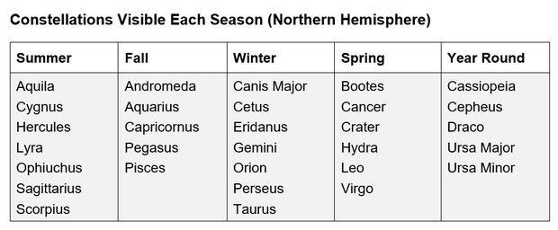 Tell students you have some additional data about constellations (see table below). Point out that there are some constellations that can be observed year-round in the Northern Hemisphere.