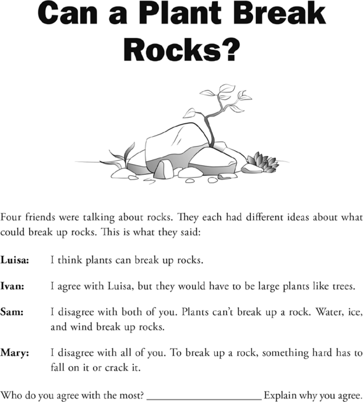 For example, consider the fourth-grade disciplinary core idea ESS.2A: Earth Materials and Systems, “Rainfall helps to shape the land and affects the types of living things found in a region. Water, ice, wind, living organisms, and gravity break rocks, soils, and sediments into smaller particles and move them around” (NGSS Lead States 2013). This includes the idea that plants can break rocks. To begin one of the lessons in an instructional sequence on understanding processes that change Earth’s surface, picture a scenario where a teacher uses the probe, Can a Plant Break Rocks? (Keeley and Tucker 2016; Figure 1) to first elicit students’ initial ideas about whether plants can break rocks.