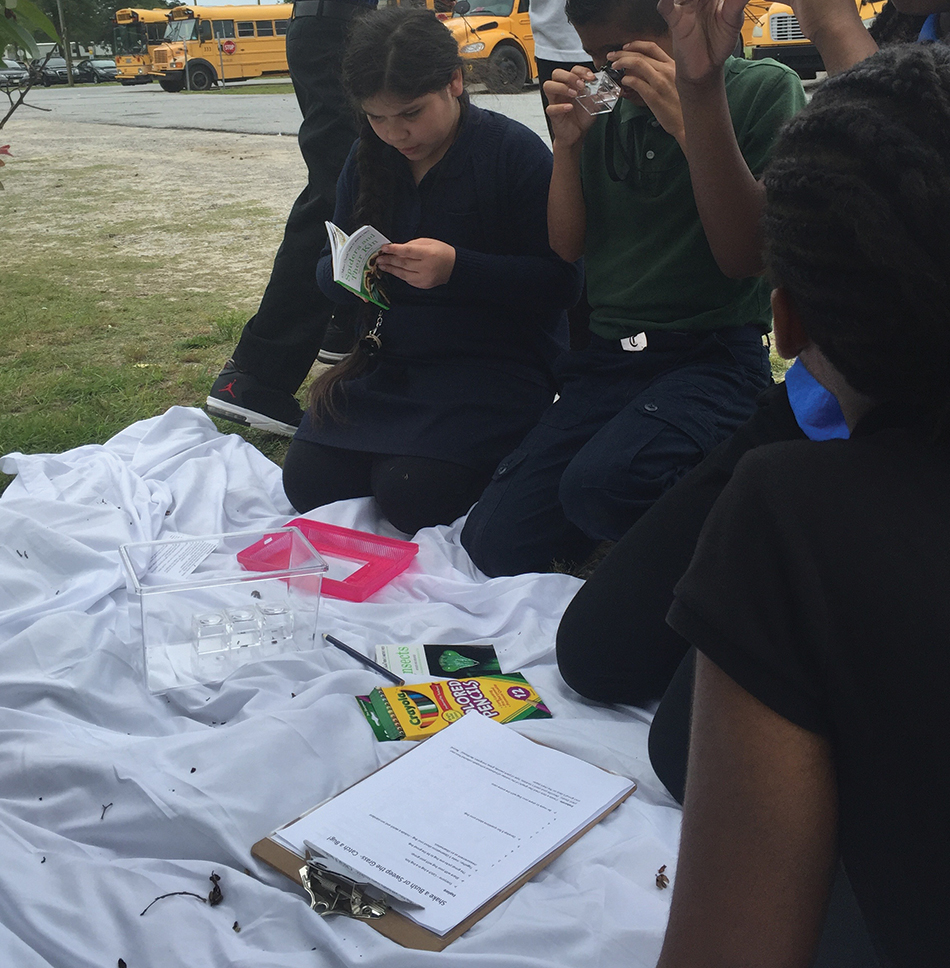 Next, students were guided to sort organisms based on a variety of characteristics that led to a discussion of the components and workings of an ecosystem. The classification analyses and interpretation of data discussion began with asking the following questions: “Can you sort your arthropods by the number of legs they have?” By starting with this question, students were able to distinguish the differences and similarities between insects, spiders, and other groups of arthropods, which led to understanding of concepts of taxonomy and relatedness. This led to us asking, “How do your arthropods move?” students provided answers like, “They crawl!” and “They fly!” Grouping by movement led to a discussion of different parts of the microhabitat or ecosystem, for example, the surface of the plant, the soil, and the air. Students used additional resources like field guides to answer questions like “What do arthropods eat?” in order to illustrate roles in the ecosystem including producers, consumers, and decomposers. After this guided discussion, students recorded this information on their arthropod order data sheet. When all activities were completed, students released all organisms to their appropriate habitat, which models proper care and concern for these living creatures.
