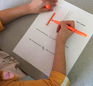 During this stage of the 5E Instructional Cycle, students practiced what they learned. Our students engaged in a variety of activities to help them build on their new understandings and to meet the performance expectations identified in the standards. First, we introduced “demonstration thermometers” to give students practice reading thermometers. While these can be purchased online, we found large, inexpensive and student-friendly versions at the dollar store that were a hit with our students. A creative teacher could also create these out of cardboard and ribbons! Students were paired up to set and read their thermometers by quizzing their partners. We first modeled the activity and then released them to practice. We found that since there are a lot of numbers on the thermometer, including a range of numbers that they didn’t yet have number sense to understand, students were asked to read the temperature to the nearest 10 degrees. Later in the year or with more advanced students, it might be appropriate to read accurate temperatures by counting lines between the 10-degree intervals on the thermometers.