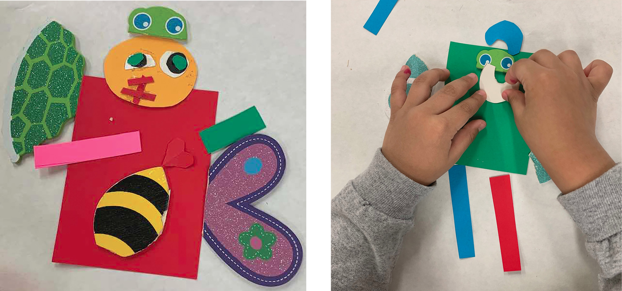 Students made robots that mimicked the structures and functions of animals (Figure 4), a principle called biomimicry. Some students added insect wings. Others added bird feathers. They said their robots could “fly to save people.” One student applied spotted armor and said the robot used the armor to “hide and change heads.” Another student assembled a “superhero” robot with limbs from different animals. She gestured to show how her robot could fly, swim, and trot. Several students used their own bodies to communicate with us about the actions that their robots could do. By accepting students’ gestures, we invited greater participation from students who had language and communication challenges.