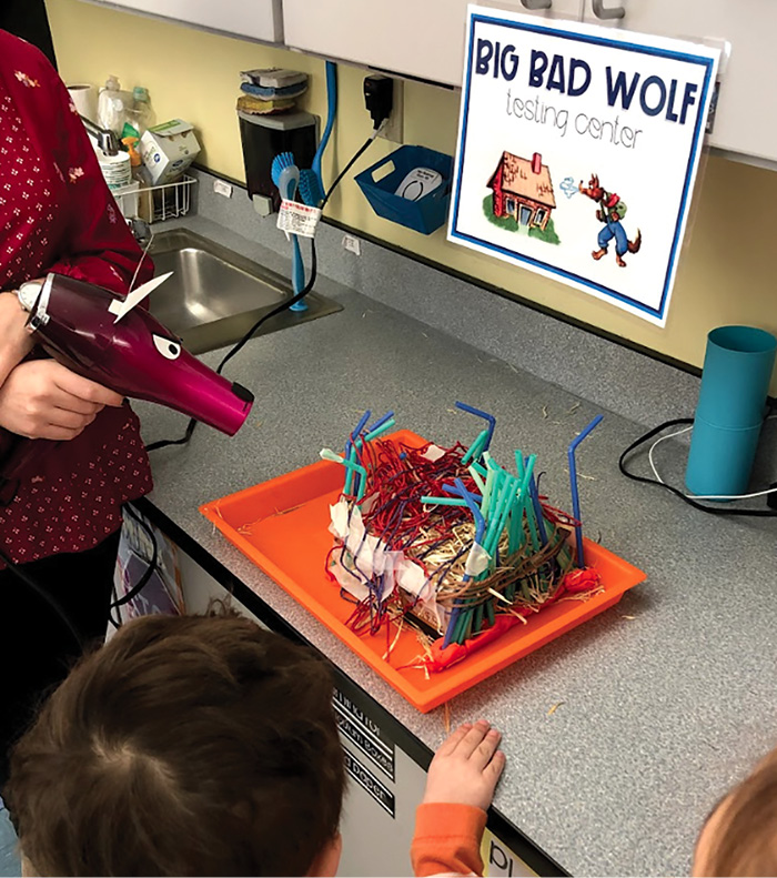 Prior to the investigation in this article, students engaged in several ELA and arts activities to build relationships with each other. During those activities, we paired students using their personality traits based on who we thought would work best together, and the communication needs of the preK students (based on IEPs). Minor adjustments needed to be made. However, we were then able to keep the same groupings together for the STEM investigation. This was extremely helpful because the students were already comfortable with each other and readily communicated to achieve their goals. There were more fourth graders than preK students, so we generally grouped approximately two to three fourth-grade students with every one to two preK students. The fourth graders used role-playing techniques to learn strategies for supporting communication and socialization with “the littles.” We planned several scenarios the fourth graders might encounter (e.g., a preK student who won’t talk or won’t remain on task, a fourth grader wanting to do a task independent of a preK student, a preK student needing encouragement to use their words to communicate) based on our observations during earlier tasks. Our biggest challenge was identifying common standards between preK and fourth grade. The NJSLS Early Childhood guidelines for STEAM recommend that students are exposed to open-ended investigations to develop their inquiry skills (https://www.state.nj.us/education/ece/guide/standards.pdf). The Three Little Pigs investigation connected fourth-grade engineering and earth science core ideas about natural hazards to preK study of weather and structures. The story provided an analogy for hurricane force winds. However, if your area does not experience hurricanes, you could revise the scenario to include strong thunder and lightning storms and/or blizzards. PreK read the classic story. The fourth grade read The True Story of the Three Little Pigs and the Big Bad Wolf (Scieszka 1989). Afterward, the fourth graders decided whether they thought the pigs or the wolf was telling the truth. We also discussed how perspective can change based on point of view.