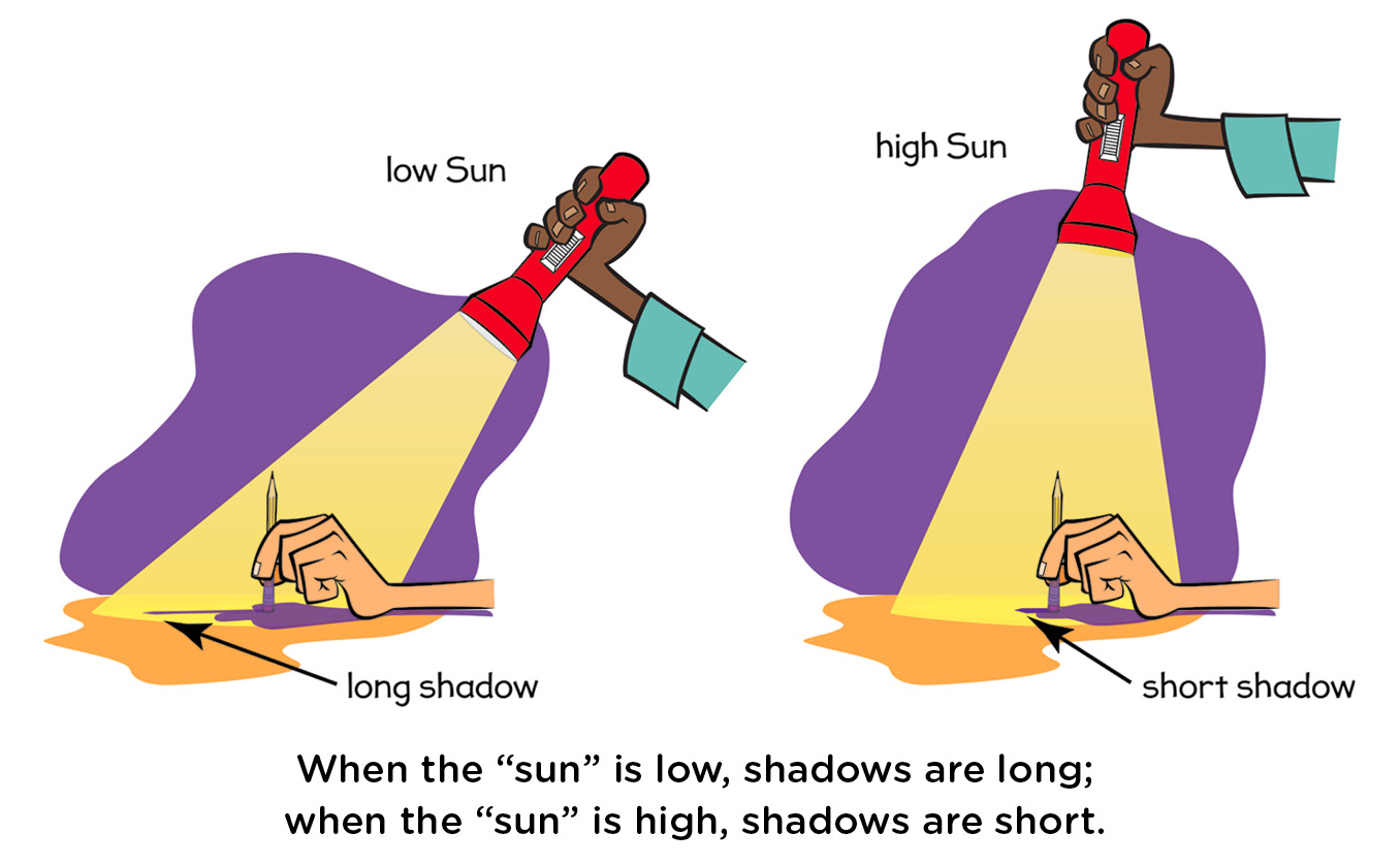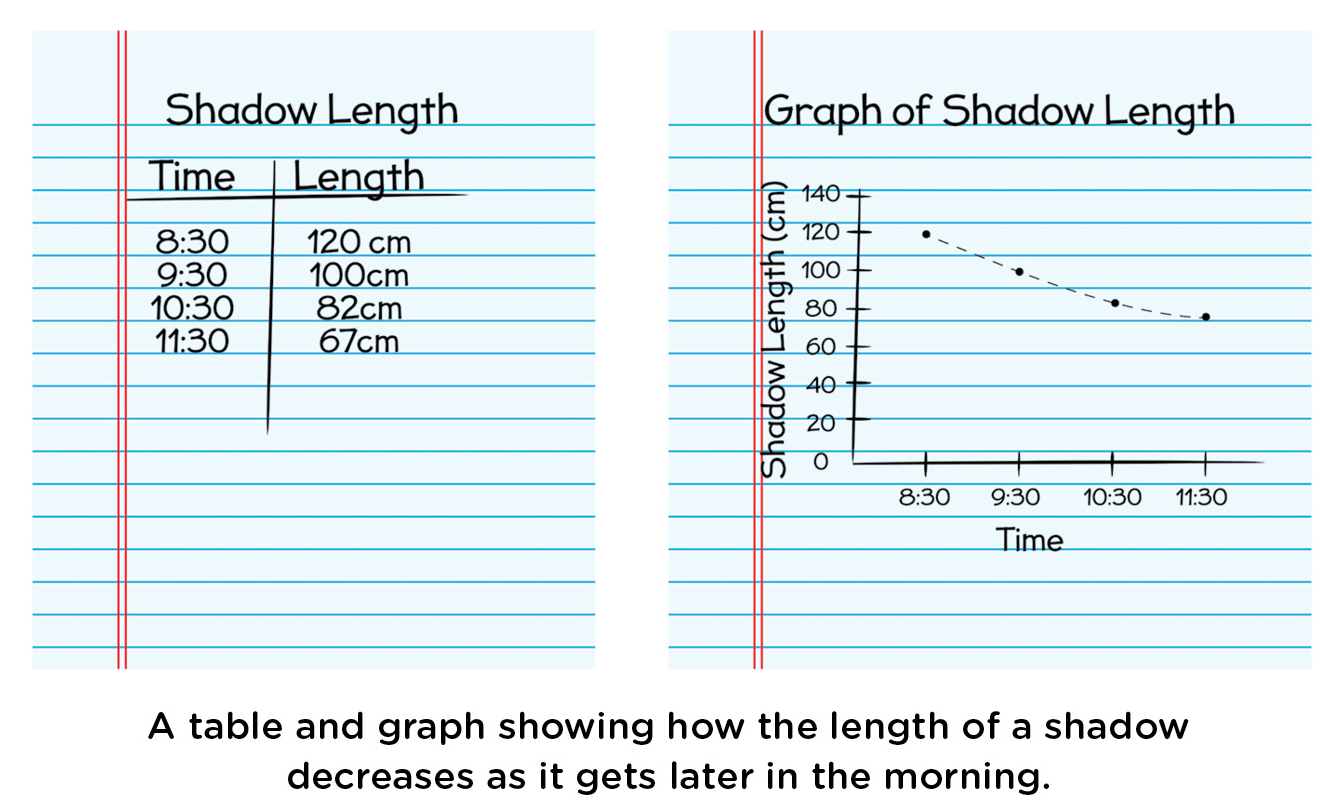 On a sunny day, starting first thing in the morning (e.g., 8:30 a.m.), have students go outside. They will work in pairs, and the students will measure the length of their partner’s shadow every hour until 11:30 a.m. They can list all the shadow lengths and if they are able (perhaps with your help), make a graph. Or you can make one graph on the board based on one student’s data. The list or graph will show how the shadow gets shorter and shorter as it gets later in the morning (see Figure 2).