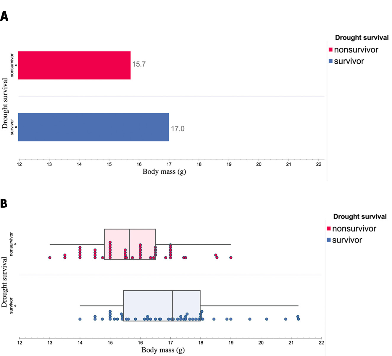 (A) average body mass size by group (survivor vs. nonsurvivor); (B) all recorded data of each bird by group. Data are from HHMI Biointeractive “Evolution in Action: Data Analysis” activity data set and are plotted using the freely available Tuva Labs software (see links to both in Online Resources).