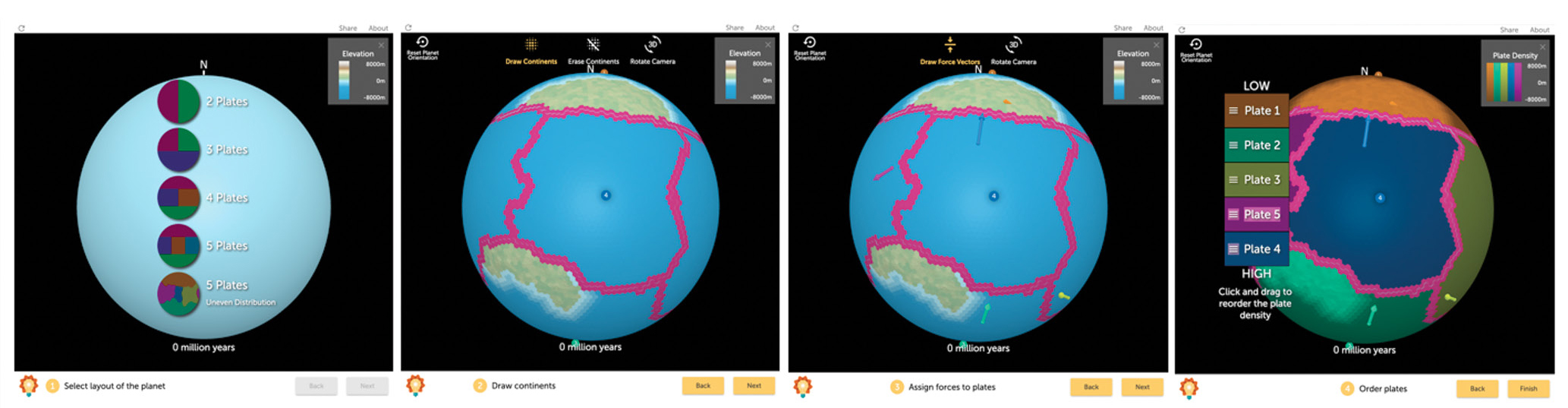 Tectonic Explorer is a dynamic computer model of a plate system on a fictional Earth-like planet (see Figure 3). The computational model that drives Tectonic Explorer is based on a physics engine that calculates forces and torques, as well as accelerations and interactions between plates. While the model was designed to be accessible to students, it was informed by current scientific understandings of plate properties found on Earth, including thermodynamic laws governing plate motion and behavior. Tectonic Explorer enables students to simulate multiple plate system scenarios and observe the different types of plate interactions responsible for patterns of events and landforms observed on Earth’s surface.