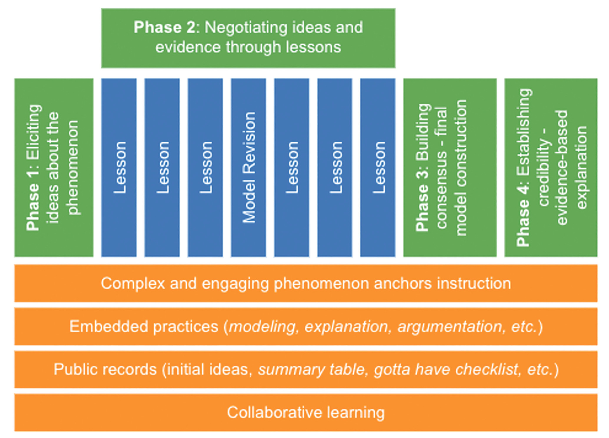 Basic overview of the unit with the four phases of MBI highlighted in green and elements of ambitious science teaching practices in orange.