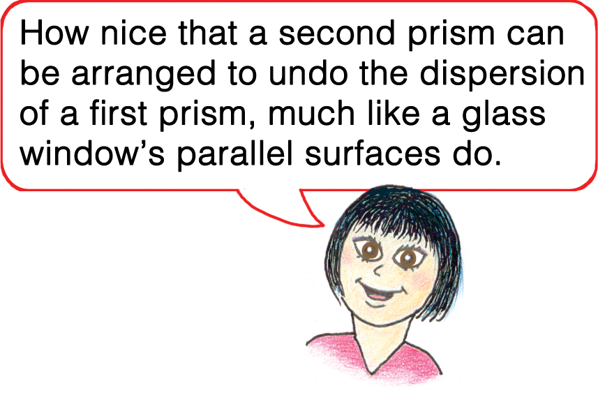 Since a prism and a windowpane are made of the same material, why doesn’t the windowpane disperse light into colors as a glass prism does? After all, light incident upon a windowpane at an oblique angle undergoes the same inside dispersion as occurs inside a glass prism (Figure 3). In the figure we see that if the entrance and exit surfaces of the pair of prisms are parallel to each other, they make up a single imaginary sheet of windowpane. The white light that enters the windowpane or prisms exits as white light.