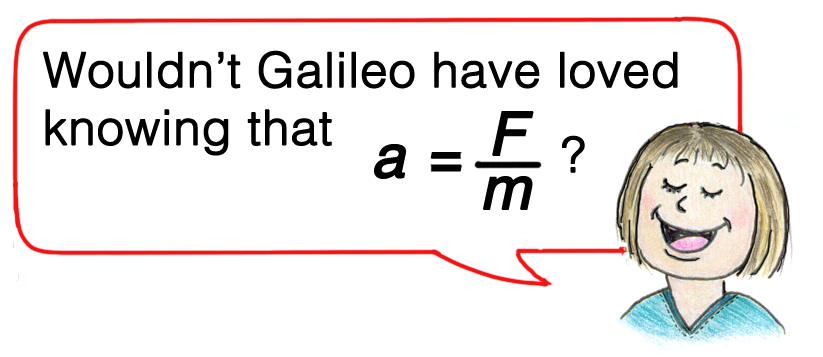 Galileo was the first to introduce the concept of acceleration. He defined velocity as the time rate of change of distance, and further defined acceleration as the time rate of change of velocity. The challenge for students is coming to terms with the idea of “time rate of change.” We introduce the symbol ∆ (delta) to denote “change in.” A change in velocity is expressed ∆v; a corresponding change in time is ∆t. We can express the equation for acceleration as a = ∆v/∆t, which is read: Acceleration is equal to the change in velocity per change in time. Maybe a small aha! if students can articulate this, and go further and and say what it means.