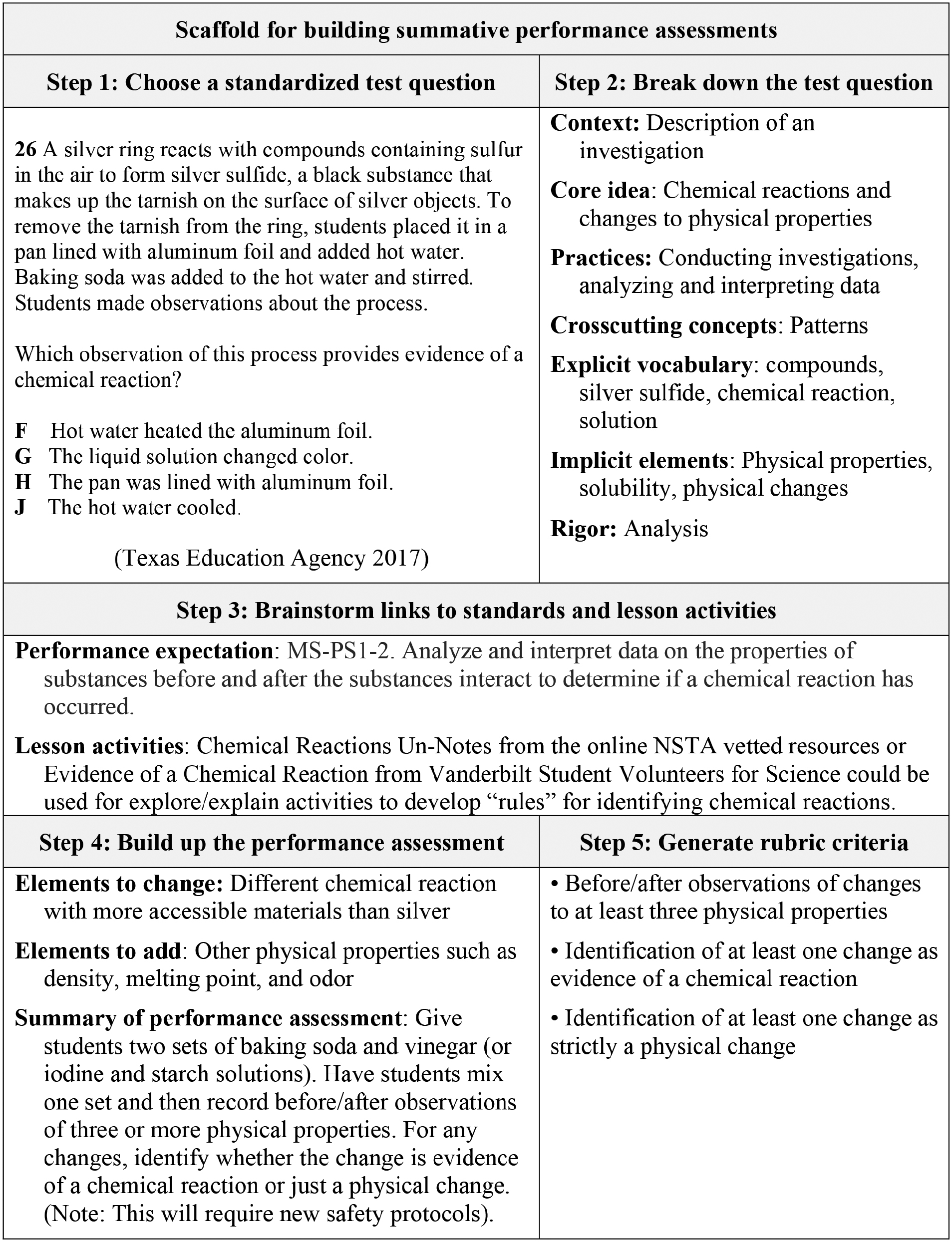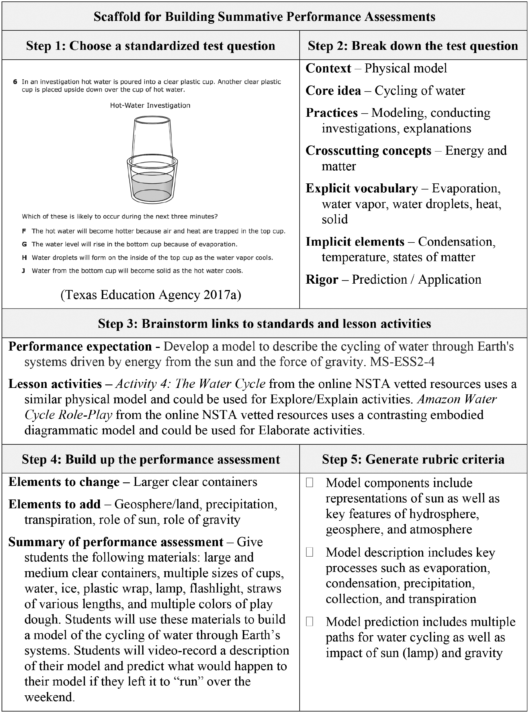 In this article, we share a five-step scaffold that we use to help teachers design their own summative performance assessments based on traditional standardized test questions (see Online Supplemental Materials). This scaffold uses the strategy of backward design (Wiggins and McTighe 1998) to build authentic classroom assessments.