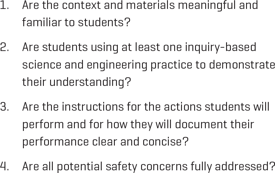 Building the summative performance assessment requires a balance of creativity and clarity in order to challenge but not confuse students. Here, we use the test item analysis from step 2 of the scaffold and the activity brainstorm from step 3 to narrow down which scenario, materials, science practices, core ideas, and vocabulary we want to emphasize. Often there are multiple ways a single test question could be transformed into an inquiry-based performance assessment. For example, the water cycle item could inspire an assessment in which students are given assorted materials and asked to construct a model of the water cycle and predict what would happen with that model over a series of days. Alternatively, students could be given a teacher-constructed model and asked to observe this model using their sight and touch senses and develop explanations for their observations. Both approaches can lead to strong performance assessments in which students use different practices of science to demonstrate their understanding of the water cycle. The scaffold includes initial space to brainstorm and summarize the assessment design. However, the final student instructions will likely need to be more detailed than this space allows. We have found the questions in Figure 3 useful during this step for self-assessing how we are designing our performance assessment.